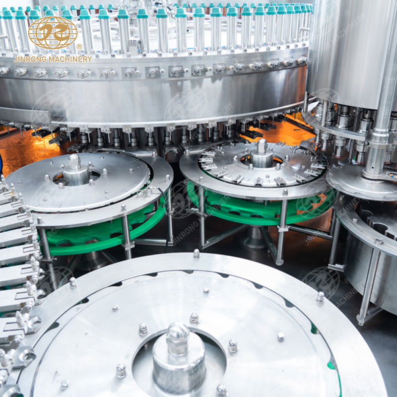 2. 預沖洗和注氣:在碳酸飲料灌裝線的第一個工作站,瓶子進入清洗區域,通過噴淋系統噴灑清洗液對瓶內進行預沖洗,去除內部的異物。然后,通過注氣系統對瓶內充入一定量的空氣,使得瓶子內外壓力平衡。